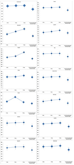 Figure 6 shows that potato variety Smak was the most optimal material for the fat accumulation, growth, and development of the potato ladybird beetle at all stages. The mortality rate was the lowest and the fecundity was the highest when the insects fed on this potato variety. The least beneficial varieties for the potato ladybird beetle were Queen Anne, Lilly, Dachny, and Kazachok, which led to the highest mortality rate with shifts in ontogenetic timing. Based on the results of our experiments, variety Belmonda had an advantage over all other potato varieties and demonstrated a complex of immune barriers against the pest. Feeding on this variety led to the highest mortality rate of the beetles with an increase in the duration of ontogenetic stages. A maximum pupa weight was detected when the pupae fed on variety Smak (ā = 54.38 mg) and Yubilyar (ā = 41.5 mg). The pupae had the lowest weight when feeding on variety Belmonda (ā = 12.28 mg). The weight of the pupae was relatively equal when they fed on the rest of the varieties, which was consistent with the mortality rates and the duration of ontogenetic stages. The presented information should be considered a valid and reliable criterion of the high resistance of potato variety Belmonda to the 28-spotted potato ladybird beetle.