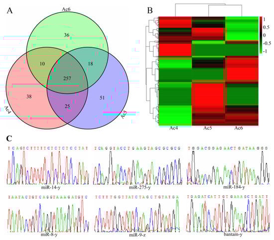 Expression analysis and molecular validation of miRNAs identified in the A. c. cerana 4-, 5-, and 6-day-old larval guts. (A) Venn analysis of miRNAs discovered in the 4-, 5-, and 6-day-old larval guts; (B) expression clustering of miRNAs expressed in the 4-, 5-, and 6-day-old larval guts; (C) Sanger sequencing of six miRNAs shared by the 4-, 5-, and 6-day-old larval guts.