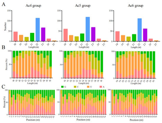 The length distribution of miRNAs in Ac4, Ac5, and Ac6 groups ranged from 18 nt to 25 nt; the most enriched length was 22 nt, followed by 23 nt and 18 nt (Figure 2A). In addition, for miRNAs with length ranging from 18 to 25 nt, the first base is always biased toward U (Figure 2B), and miRNAs in the aforementioned three groups had similar bias at each base (Figure 2C).