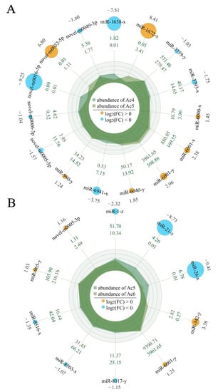 Radar maps of DEmiRNAs in the Ac4 vs. Ac5 (A) and Ac5 vs. Ac6 (B) comparison groups. Blue circles represent downregulation, while orange circles represent upregulation. The larger the circles, the greater the difference.