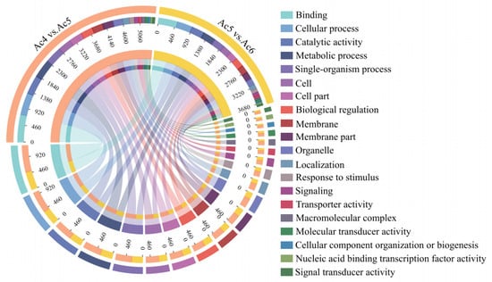 GO terms annotated by the DEmiRNA-targeted mRNAs in the Ac4 vs. Ac5 and Ac5 vs. Ac6 comparison groups. Different colors indicate different functional terms. The numbers inside the chord diagram indicate target mRNAs annotated to corresponding terms.