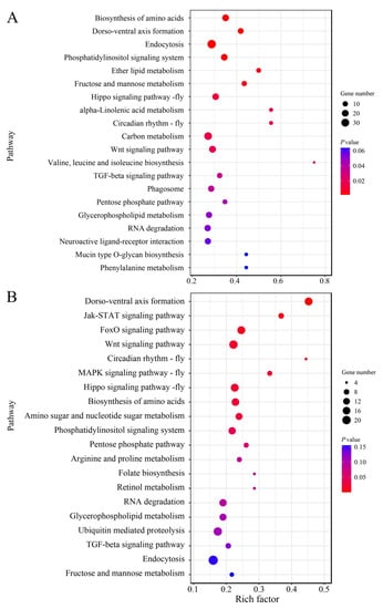 KEGG pathways annotated by the targets of DEmiRNAs in the Ac4 vs. Ac5 (A) and Ac5 vs. Ac6 (B) comparison groups. Bubbles indicate target mRNAs enriched in corresponding pathways; the larger the bubbles, the greater the amount of target mRNAs, and the smaller the bubbles, the fewer the target mRNAs. Different colors represent the p-values of different pathways; the red color indicates higher p-values, while the purple color indicates lower p-values.