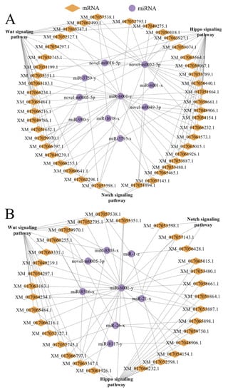 DEmiRNA–mRNA networks relevant to development-associated signaling pathways in the Ac4 vs. Ac5 (A) and Ac5 vs. Ac6 (B) comparison groups. Orange diamonds represent target mRNAs, while purple circles represent DEmiRNAs. Grey lines indicate potential targeting relationships between DEmiRNAs and target mRNAs.