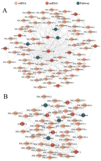 DEmiRNA-mRNA networks involved in the cellular and humoral immune in the Ac4 vs. Ac5 (A) and Ac4 vs. Ac5 (B) comparison groups. Orange circles represent target mRNAs, red circles represent miRNAs, and green circles represent annotated pathway. Grey lines indicate potential targeting relationships between the miRNAs–mRNAs pathway.