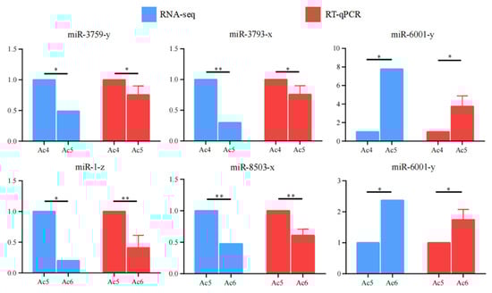 In the Ac4 vs. Ac5 comparison group, seven up-regulated and eight down-regulated miRNAs were detected; of these, the three most up-regulated miRNAs were miR-1672-x (log2FC = 8.41, p < 0.01), novel-m0032-5p (log2FC = 6.79, p < 0.01), and miR-6001-y (log2FC = 2.96, p < 0.05), while the three most down-regulated ones were novel-m0016-5p (log2FC = −9.25, p < 0.01), novel-m0016-5p (log2FC = −9.25, p < 0.01), and miR-6941-x (log2FC = −3.74, p < 0.05), respectively (Figure 3A). Comparatively, there were four up-regulated and six down-regulated miRNAs in the Ac5 vs. Ac6 comparison group (Figure 3B), and of these, the most up-regulated miRNA was miR-342-y (log2FC = 3.38, p < 0.05), followed by miR-6001-y (log2FC = 1.25, p < 0.05) and novel-m0005-3p (log2FC = 1.16, p < 0.05), whereas the most down-regulated miRNA was miR-26-x (log2FC = −9.41, p < 0.01), followed by miR-21-x (log2FC = −8.73, p < 0.01) and miR-1-z (log2FC = −2.32, p < 0.05) (Figure 3B).
