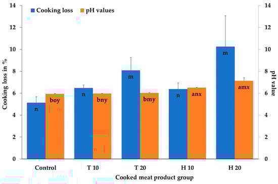 Mean and standard deviation values of the cooking losses and pH values after cooking of the cooked meat products depending on the meat product group; T 10/T 20 consist of 10%/20% homogenized Tenebrio molitor larvae, H 10/H 20 consist of 10%/20% homogenized Hermetia illucens larvae; ab bar graphs with different letters differ significantly (p ≤ 0.05) between the species (N = 6 per species) and controls (N = 3); mno bar graphs with different letters differ significantly (p ≤ 0.05) between the concentrations (0% (N = 3), 10% (N = 6), 20% (N = 6)); xy bar graphs with different letters differ significantly (p ≤ 0.05) between the interaction of species and concentrations (N = 3).