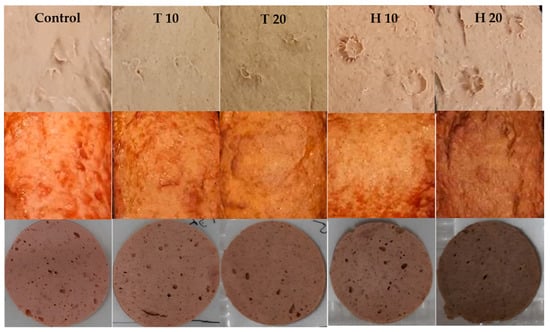 Images of the cooked meat products before (top) and after cooking (center) and of round slices of the products with an area of 25.5 cm2 before packaging in modified atmosphere packages (bottom) depending on the meat product group; T 10/T 20 consist of 10%/20% homogenized Tenebrio molitor larvae, H 10/H 20 consist of 10%/20% homogenized Hermetia illucens larvae.