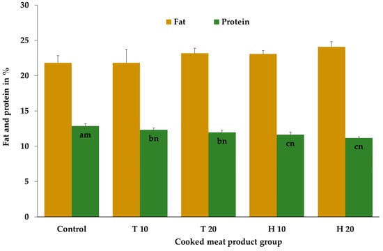 Mean and standard deviation values of the fat and protein contents of the cooked meat products after cooking depending on the meat product group; T 10/T 20 consist of 10%/20% homogenized Tenebrio molitor larvae, H 10/H 20 consist of 10%/20% homogenized Hermetia illucens larvae; abc bar graphs with different letters differ significantly (p ≤ 0.05) between the species (N = 6 per species) and controls (N = 3); mn bar graphs with different letters differ significantly (p ≤ 0.05) between the concentrations (0% (N = 3), 10% (N = 6), 20% (N = 6)).
