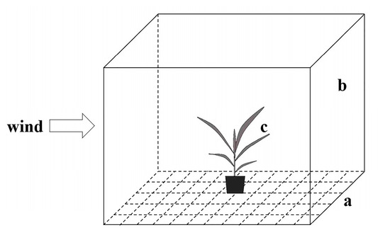 Schematic diagram of the experiment layout, including: (a) floor covered with sticky plates (only 60 shown for simplicity); (b) wind shelter with four two-m-tall walls, with the two facing the fan being removed when needed; and (c) central location of an infested test plant.