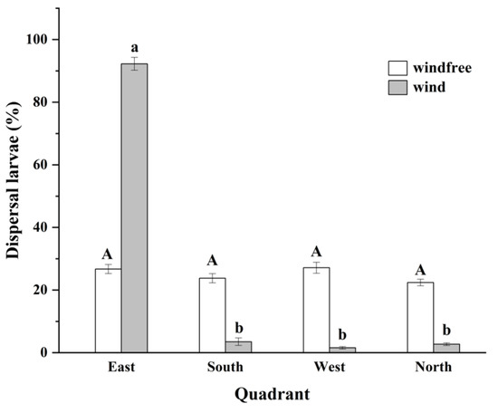 Percent of 1st-instar FAW larvae that dispersed by ballooning and were later collected in one of four directional quadrants relative to the test plant under conditions with no wind or with a mild wind that moved the air west to east. The same uppercase letters indicated no significant differences among the four directional quadrants when tested with no wind. The different lowercase letters indicated there were significant differences among the four directional quadrants when tested with mild wind. Pwindfree = 0.136, Pwind = 0.000.