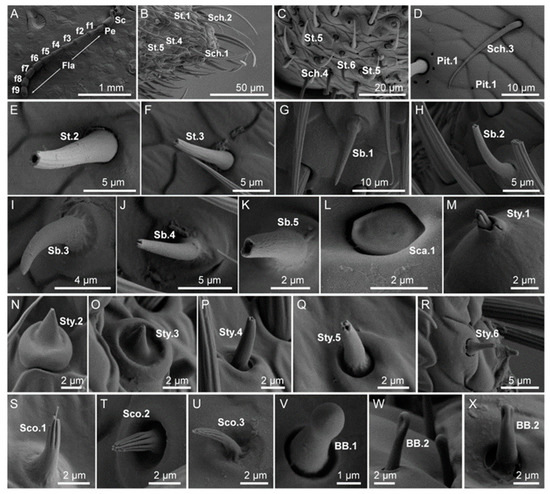(A) Morphology of Agasicles hygrophila adult antennae; Sc, scape; Pe, pedicel; Fla, flagellum. SEM structure of antennal sensilla of A. hygrophila. (B) Sensilla chaetica (Sch.1, Sch.2), sensilla trichodea (St.1, St.4, St.5); (C) sensilla chaetica (Sch.4), sensilla trichodea (St.5, St.6); (D) sensilla chaetica (Sch.3); (E) sensilla trichodea (St.2); (F) sensilla trichodea (St.3); (G) sensilla basiconca (Sb.1); (H) sensilla basiconca (Sb.2); (I) sensilla basiconca (Sb.3); (J) sensilla basiconca (Sb.4); (K) sensilla basiconca (Sb.5); (L) sensilla campaniform (Sca.1); (M) sensilla styloconica (Sty.1); (N) sensilla styloconica (Sty.2); (O) sensilla styloconica (Sty.3); (P) sensilla styloconica (Sty.4); (Q) sensilla styloconica (Sty.5); (R) sensilla styloconica (Sty.6); (S) sensilla coeloconica (Sco.1); (T) sensilla coeloconica (Sco.2); (U) sensilla coeloconica (Sco.3); (V) Böhm bristles (BB.1); (W) Böhm bristles (BB.2); (X) Böhm bristles (BB.2).