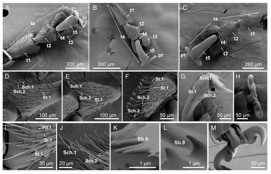 Sch.4 were distinguished by longitudinal ridges on the surface and an erect base, and the apical was slender, sharp, and curved toward the surface at nearly 90°. Sch.4 were found in the middle and lower parts of antennal flagellum segments 8–9 (Figure 1C) and in the maxillary palps (Figure 2M).