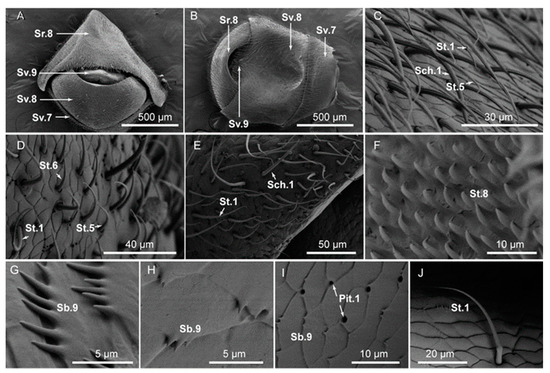Sb.10 had a smooth wall with a circle of large, shallow sockets at the base. The tip was twisted and without a hole, and the epidermis at the base was wrinkled. Sb.10 were distributed on the maxillary palps (Figure 2G).