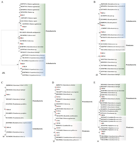Neighbor-joining tree of bacterial isolates from P. xylostella and their closely related species based on sequencing of the 16S rDNA gene. The nodes’ bootstrap values were based on 1000 replicates. The scaled bar represents 0.02 estimated phylogenetic divergence. (A–E), respectively, represent phylogenetic analysis of 16S rDNA of bacteria of the 4th instar larval gut, pupal gut, adult gut, ovary, and eggs in P. xylostella. The numbers corresponding to the red circle in the figure are the bacteria obtained in this study: R represents bacteria in radish sprouts, RL represents gut bacteria in the 4th instar larvae of P. xylostella, RP represents gut bacteria in the pupae of P. xylostella, RM represents gut bacteria in adult P. xylostella, OV represents ovarian bacteria in P. xylostella, and SE and RE represent bacteria in eggs of P. xylostella.