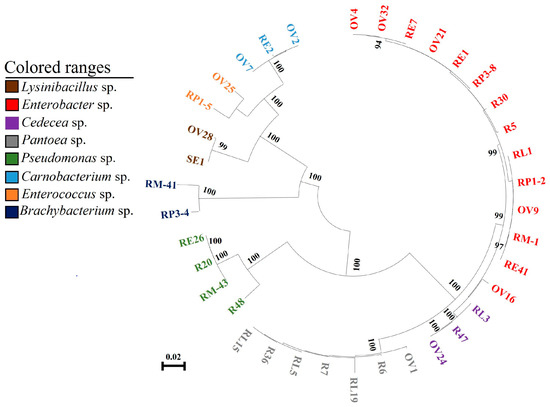 Neighbor-joining tree of bacterial isolates from P. xylostella. The nodes’ bootstrap values were based on 1000 replicates. The scaled bar represents 0.02 estimated phylogenetic divergence. R represents bacteria in radish sprouts, RL represents gut bacteria in the 4th instar larvae of P. xylostella, RP represents gut bacteria in the pupae of P. xylostella, RM represents gut bacteria in adult P. xylostella, OV represents ovarian bacteria in P. xylostella, and SE and RE represent bacteria in eggs of P. xylostella. As shown in the colored range in the figure, different colors indicate different genera.