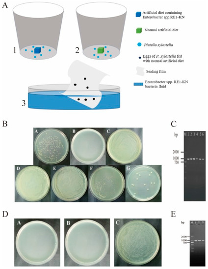 3. Detection: (1) P. xylostella fed on a diet containing Enterobacter sp. RE1-KN, then LB solid mediums containing kanamycin were coated with the gut solution of the P. xylostella (4th instar larvae, pupae, and adults), adult ovaries, and the sterile water, which soaked eggs (The eggs of P. xylostella feeding on the diet containing Enterobacter sp. RE1-KN were brushed onto a sterile weighing paper with a sterile bristle brush. Then, the eggs were placed in a centrifuge tube, and sterile water was added). The plates were sealed and incubated upside down at 37 °C for 12 h. (2) PCR detection: Some single colonies were selected and put into a 1.5 mL centrifuge tube containing 20 μL Elution Buffer (Nanjing Vazyme Biotech Co., Ltd., Nanjing, China) that can elute PET28a-EGFP plasmid from Enterobacter sp. RE1-KN, then it was heated in a water bath at 95 °C for 10 min. After centrifugation, 1 μL of supernatant was obtained, and PCR amplification was performed using T7 primer selection system (Table S1) and procedure (Table S2).