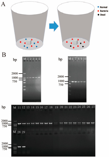 2. Detection (1) LB solid mediums containing kanamycin were coated with the gut solution of 4th instar larvae in the treatment group and control group, which were sealed and put into an incubator at 37 °C. After 12 h, the LB solid mediums were observed for colony growth. (2) PCR detection was the same as in Section 2.3.1.