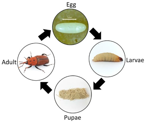 RPW is a sexually dimorphic [] and holometabolous insect, as it has four developmental stages that consist of egg, larvae, pupae and adult (Figure 1) []. It takes about 45 to 298 days to complete the whole lifecycle, depending on their diet []. The female RPW has a high fecundity rate, producing around 180–396 eggs throughout its lifespan [].