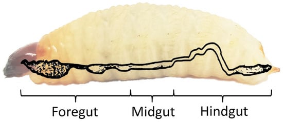 When the damage due to infestation worsens, a chewing sound can be heard when one’s ear is close to the palm trunk []. In addition to the RPW’s strong mouthpart, this economically important pest also possesses an alimentary gut system that can digest the high-fiber food that it ingests. The gut can be divided into three different parts (Figure 2): foregut, midgut and hindgut [,,]. Mainly, the foregut is used to eat the food, and the hindgut is for the absorption of water. The secretion of enzymes and digestion of food occur in the midgut [].