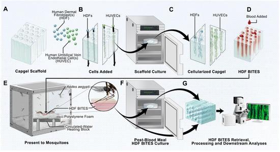 Schematic overview of the BITES platform. (A) Illustration of a sterile Capgel block depicting the patent capillary microstructure. (B) Loading/charging of the Capgel with either human dermal fibroblasts (HDFs) or human umbilical vein endothelial cells (HUVECs) into the capillaries of the block. (C) Culture of the human cell-laden Capgel to cellularize the block. (D) Loading of blood into the capillaries of the cellularized Capgel to create a BITES construct. (E) Presentation of the BITES construct to female Aedes (Ae.) aegypti mosquitoes (prototypic arthropod) for natural biting, probing, and blood-feeding. Inset: Zoomed-in depiction of a mosquito with the stylet inserted into the BITES construct, engaging in natural biting/probing/blood-feeding. (F) Transfer of the BITES construct from the mosquito cage into an incubator for (optional) post-biting/probing/blood-feeding cell culture. (G) Retrieval of the BITES construct following post-biting/probing/blood-feeding cell culture (if any) for processing and various downstream biological analyses.
