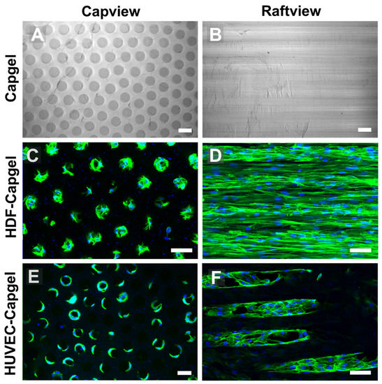 HDFs and HUVECs line scaffold capillaries with tissue when cultured within Capgel biomaterials for four (4) weeks. (A,B) Representative DIC micrographs of Capgel imaged in capview and raftview orientations, respectively. (C,D) Representative maximum z-projection confocal fluorescence micrographs of HDF tissue structures formed within Capgel scaffold cultures imaged in capview and raftview orientations, respectively. (E,F) Representative maximum z-projection confocal fluorescence micrographs of HUVEC tissue structures formed within Capgel scaffold cultures imaged in capview and raftview orientations, respectively. Green fluorescence: Actin Green 488 nm cytoskeletal staining; blue fluorescence: Nucblue nuclei staining. Scale bars = 100 µm for (A,B) and 50 µm for (C–F).