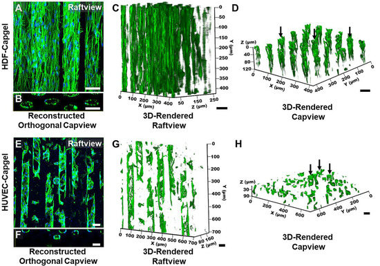 The microvessel-like 3D tissue morphologies formed by the cells during culture in the scaffolds are evident in Figure 4. Consistent with the Figure 3 data, the raftview maximum z-projection confocal fluorescent micrographs show the extensive HDF tissue formations throughout the Capgel (Figure 4A) and the focal structures formed by HUVECs (Figure 4E). Also consistent are the associated reconstructed orthogonal capviews showing that both HDFs and HUVECs lined the capillary walls to form patent, tubular tissues (Figure 4B,F, respectively). The dense scaffold cellularization by HDFs is evident in the 3D raft- and capview renderings (Figure 4C,D, respectively), as is the more diffuse HUVEC cellularization of the Capgel (Figure 4G,H, respectively).