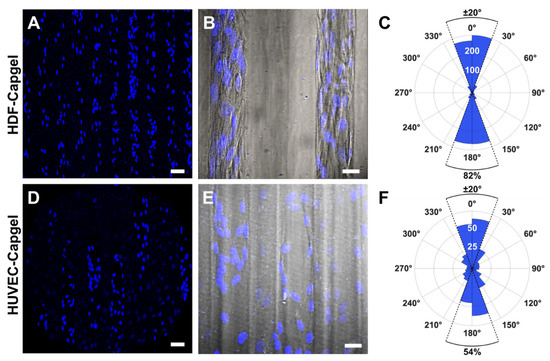HDFs and HUVECs comprising microvessel tissues engineered with Capgel biomaterials align preferentially in the direction of the scaffold capillary long axis during four (4) weeks in culture. (A) Representative confocal fluorescence maximum z-projection micrograph showing NucBlue-stained nuclei of HDFs cultured in Capgel. (B) Overlay image of representative confocal fluorescence maximum z-projection and corresponding DIC micrographs of scaffold-cultured HDFs stained with NucBlue. (C) Polar plot quantifying the nuclear alignment of HDFs cultured in Capgel as determined by first fitting ellipses to binarized images (n = 12) of NucBlue-stained nuclei and then measuring the angle of each best-fit ellipse major axis relative to the scaffold capillary long axis defined as either 0° or 180°. The upper half of the polar plot ranging from −90° to 90°, which includes 0°, describes nuclei in the top half of the analyzed images, while the lower half of the plot from 90° to 270°, which includes 180°, describes the nuclei in the bottom half of these images. The radial value of the arcs for blue-shaded sectors indicates the total number of nuclei, i.e., cells, within the covered range of relative angles. (D–F) These panels are the same types of images and plots as panels (A–C), respectively, but for HUVECs scaffold-cultured in Capgel (n = 6 for (F)). Blue fluorescence: NucBlue nuclei staining; gray: DIC. Scale bars = 50 µm for (A,D), 20 µm (B,E).