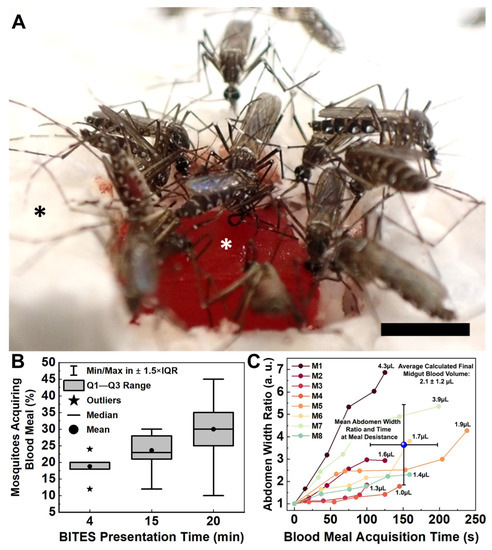 Female Aedes aegypti mosquitoes swarm warmed BITES tissue loaded with blood and engage in frenzied blood meal acquisition behaviors. (A) Representative image captured from a video (Video S9) presenting a warmed (34–37 °C), blood-loaded BITES construct (cellularized with HDFs) in the raftview orientation to 50 mosquitoes for 15 min. (B) Box plot summarizing the percentages of Ae. aegypti (out of 50 total) that demonstrated blood meal acquisition behaviors on BITES human dermal microvascular bed model tissues (HDF-cellularized) presented for either 4, 15, or 20 min in separate experiments. (C) Plot of abdomen width ratio (Equation (1)) increases over acquisition time for six (6) individual females taking blood meals from an HDF BITES construct presented for 15 min (Video S9). The average abdomen width ratio at the average time to blood meal desistance for all mosquitoes analyzed is indicated by the blue sphere in the plot, with error bars for both values. Numbers listed next to each final width ratio point indicate the final estimates of blood volumes in the corresponding mosquito midguts, calculated as before (Equations (2) and (3)). In panel (A), the white asterisk indicates the HDF-cellularized BITES tissue loaded with blood; the black asterisk indicates polystyrene foam insulation. In the box plot (B), vertical brackets = whiskers within Tukey’s 1.5 × interquartile (IQR) range, gray boxes = IQR, stars = outliers, horizontal lines = medians, dots = means; note that the median for 4 min equals/overlaps Q3 and the whiskers for this presentation time fall within the IQR and therefore are not shown. Error bars in (C) = ± standard deviation (SD). Scale bar = 2 mm.
