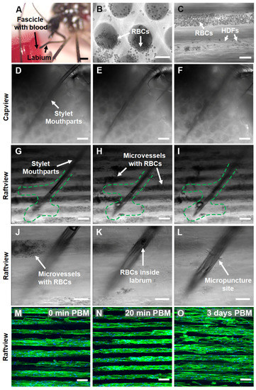 As with the blood-loaded Capgel, HDF cellularization did not prevent the free movement/flow of blood within the BITES microvessels (Figure 7B,C, Videos S7 and S8). A DIC micrograph and corresponding 3D-rendered depth profiling of the situation revealed that the mosquito pushed the fascicles of stylet mouthparts ~500 µm into the BITES tissue, a depth at which dermal microvessels would be encountered in humans (Figure S3) [48,59]. A closer inspection of this penetration by DIC microscopy in the capview and raftview orientations showed that several layers of the microvessel structures were pierced (Figure 7D–I, respectively) and a track with an irregular “interaction volume” was created (Figure 7G–I, green dashed lines). The paucity of RBCs observed in this track and interaction volume indicates that the total volume of the blood meal was extracted from multiple BITES microvessel structures, even with the apparent narrowness of the punctures (Figure 7J–L). Confocal microscopy additionally demonstrated that the BITES microvessel structures were intact after blood meal acquisitions and that BITES tissue can be viably cultured for at least three days following presentation to and engagement by mosquitoes (Figure 7M–O). No signs of apparent contamination were observed in these post-blood-meal BITES tissue cultures. Antibiotics (penicillin and streptomycin) were standard components of all culture media in this study, helping to reduce/abrogate the bacterial load. The use of these compounds in future BITES studies with other potential vectors (e.g., ticks) and pathogens such as Borrelia burgdorferi will likely require careful consideration of both the antibiotic dose and class used, if any. Similar considerations may also be important if microbiome studies are envisioned. These data, especially the demonstration that BITES tissue can be cleanly cultured post-blood-meal for some days, highlight the potential application of the platform in future studies investigating phenomena such as vectored pathogen infection sequences, kinetics, and sequelae.