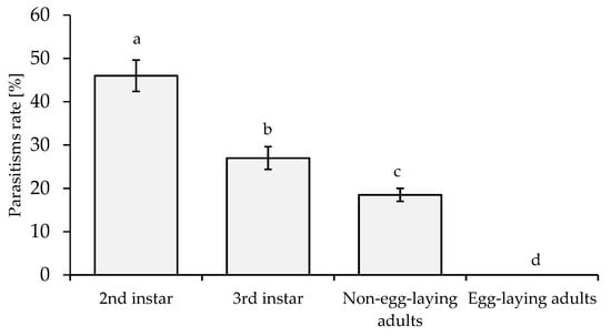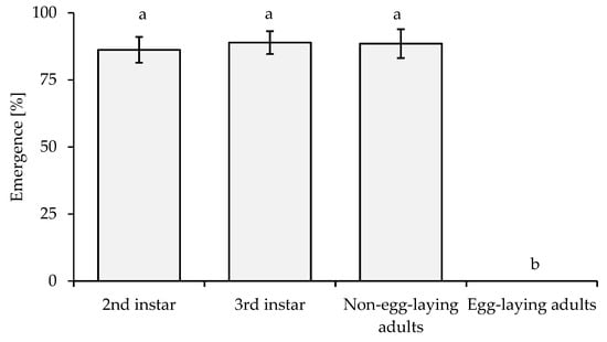 Similarly, the emergence values (%) of A. papayae from different host stages of P. marginatus were significantly different (p ≤ 0.01, F = 73.853). The emergence of A. papayae was high on second-instar, third-instar, and non-egg-laying adults. The emergence ranged from 86% to 89%, compared with 0% for egg-laying adults (Figure 2).