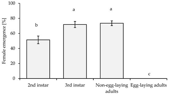 The numbers of female emergences (%) of A. papayae parasitizing different stages of P. marginatus were significantly different (p ≤ 0.01, F = 142.741). The lowest female emergence rate was observed on egg-laying adults (0%), while the highest female emergence was 74% on non-egg-laying adults and third instars. The second instar showed the most balanced gender ratio of emerging A. papayae (Figure 3).