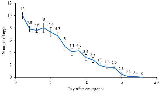 Acerophagus papayae has the potential to be mass-produced for biocontrol programs []. To effectively rear A. papayae for biocontrol strategies, it is crucial to have a good understanding of their immature developmental time, longevity, and lifetime fertility []. Each female parasitoid wasp can produce approximately 60 eggs in total over their lifespan (Figure 4). Female A. papayae lay most of their eggs within the first 6 to 7 days after emergence, which is a critical stage to consider when determining the optimal timing to release the wasp into the wild. This enables the wasp to adapt to the natural environment and take full advantage of their egg-laying potential [].