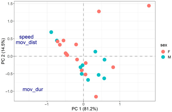 PCA on activity traits (speed = locomotory speed, mov_dist = distance moved, mov_dur = movement duration). The two axes explained 81.2% and 14.5% of the data variability for a total of 95.7%. Distance moved, locomotory speed and movement duration were all negatively related to PC1 (loadings of −1.57, −1.57 and −1.39, respectively). Distance moved (0.40) and locomotory speed (0.43) were positively related to PC2, whereas movement duration (−0.94) was negatively related to PC2. PCA did not reveal any clear behavioural groups, and no significant relationship was found between the PCA results and body size (R2 = 7.05%, p-value = 0.442) or sex (R2 = 3.06%, p-value = 0.527).