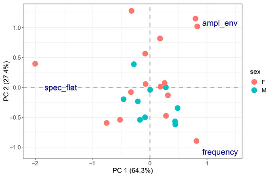 PCA on distress calls (spec_flat = spectral flatness, ampl_env = median amplitude envelope). The two axes explained 64.3% and 27.4% of the data variability for a total of 91.7%. Spectral flatness was mainly related to PC1 (PC1 loading = −1.56, PC2 loading = 0.002), while frequency (PC1 loading = 1.23, PC2 loading = −1.08) and median amplitude envelope (PC1 loading = 1.23, PC2 loading = 1.08) were related to both PC axes. PCA did not reveal any clear behavioural groups, and no significant relationship was found between the PCA results and body size (R2 = 10.8%, p-value = 0.286) or sex (R2 = 7.14%, p-value = 0.178).