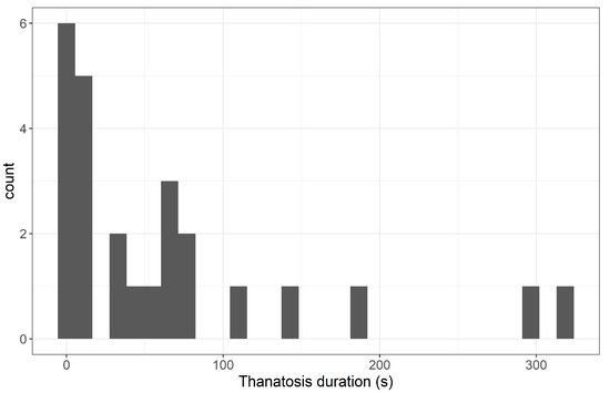 Duration of thanatosis varied from individual to individual. The distribution was right-skewed, with 56% of the individuals showing values below 50 s (Figure 4).