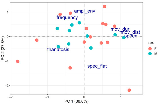 Incidentally (and interestingly), PCA also confirmed and reinforced the results of the correlation analyses: locomotor behaviour and thanatosis were located on the same axis, but the direction of the correlations was opposite (in keeping with the negative correlation between the two behaviours), whereas the traits relating to distress calls were located on different axes (in keeping with the lack of a correlation between the acoustic signal and the other two behaviours).