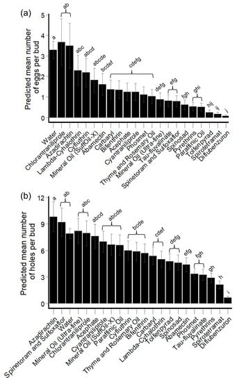 Generalized linear mixed model (GLMM)-predicted mean number (±SE) of HBW eggs and feeding/oviposition holes per hibiscus bud among insecticide and horticultural oil products across all post-experimental setup (PES) checkpoints. (a) Replacement experiments: number of HBW eggs within each collected hibiscus bud; and (b) replacement experiments: number of HBW feeding/oviposition holes within each collected hibiscus bud. Treatments with different letters were significantly different from one another (p < 0.05; t-tests).