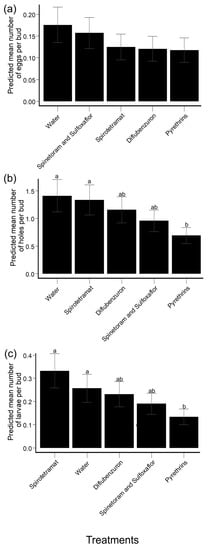 Across all treatments, hibiscus buds collected at 28 days (0.06 EMM [0.03–0.12 95% CI]), 19 days (0.09 EMM [0.05–0.15 95% CI]), and 7 days PES (0.09 EMM [0.05–0.18 95% CI]) contained significantly fewer HBW larvae than hibiscus buds collected at 4 days (0.31 EMM [0.22–0.45 95% CI]), 0 days (0.57 EMM [0.43–0.75 95% CI]), and 1 day PES (1.2 EMM [0.95–1.5 95% CI]). Across all PES checkpoints, hibiscus buds collected from pyrethrins-treated plants (0.13 EMM [0.08–0.22 95% CI]) contained significantly fewer HBW larvae than hibiscus buds collected from water control plants (t-test: t ratio = −2, df = 805, p = 0.045) and spirotetramat-treated plants (t-test: t ratio = −2.9, df = 805, p = 0.004) (Figure 5c, Supplementary Figure S9).