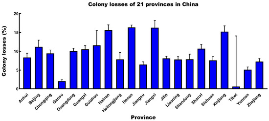 As one of the major insect pollinators, honey bees are of vital significance to global food security and ecological balance [1,2]. However, pathogen invasion and pesticide abuse have led to a decline in honey bee colonies, resulting in severe threats to biodiversity, agriculture, and ecosystem [3,4,5]. Mounting evidence suggests that a decline in feral and managed honey bee colonies has occurred worldwide [6,7]. Consequently, colony losses have been surveyed across several continents in recent years [8,9,10,11]. Unexpectedly, the United States witnessed a sudden death of honey bee colonies in 2006, which raised great concern for colony losses. Since then, the overwintering mortality of honey bees has been investigated annually in the United States [12,13,14,15,16,17,18]. Soon after, many countries in Europe jointly surveyed winter colony losses in the efforts of Prevention of honey bee COlony LOSSes (COLOSS) [19,20,21,22,23,24]. Currently, colony losses are surveyed in many parts of the world, including Asia [25,26,27,28], Africa [29], the Americas [14,30,31,32,33,34,35], Europe [36,37,38], and Oceania [9,39], most of which present high loss rates. In China, continuous and systematic surveys on the winter mortality of managed honey bee colonies date back to 2009, even though a massive colony collapse has not been reported yet. To date, several colony loss surveys in China reported that the overall mortality of honey bees is maintained at a low level. Moreover, this loss rate is substantially influenced by risk factors such as queen problems, operation size, and the proportion of new queens [26,27,28].