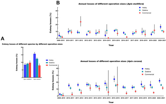 Comparison of the proportion and mortality of different apiaries. (A) The number of respondents/colonies by different types of apiaries. (B) Comparison of winter colony losses (%, 95% CI) by different types of apiaries for the years (2009–2021).