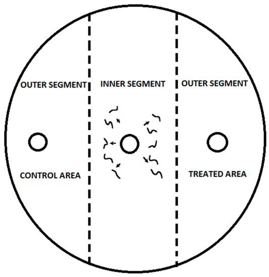 The Laznik and Trdan experiment [6,39] served as the basis for the chemotaxis assay. The assay involved the use of Petri dishes (ø = 9 cm) with 25 mL of 1.6% technical agar (Biolife, Milan, Italy), 5 mM potassium phosphate (pH 6.0), 1 mM CaCl2, and 1 mM MgSO4 (Figure 1). Each treatment was replicated ten times. The Petri dishes were kept in a rearing chamber (RK-900 CH, Kambič Laboratory equipment, Semič, Slovenia) at 18 and 20 °C and 75% RH. After 24 h, nematodes were immobilized by freezing the Petri dishes at −20 °C for 3 min. Nematodes were counted under a Nikon C-PS binocular microscope (Nikon Corporation, Tokyo, Japan) at 25× magnification. The specific chemotaxis index (CI), developed by Bargmann and Horvitz [40] and modified by Laznik and Trdan [6], was used. The CI was calculated using the following formula: