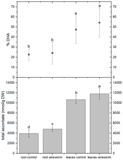 Concentrations of total ascorbate (nmol/g DW) and dehydroascorbate (% of total) in the roots and leaves of non-attacked plants and plants which had been attacked by wireworms. Different letters (a–d) indicate statistical differences (p < 0.05) between control and attacked plants.