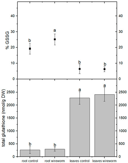 Concentrations of total glutathione (nmol/g DW) and oxidized glutathione (% of total) in the roots and leaves of non-attacked plants and plants which had been attacked by wireworms. Different letters (a, b) indicate statistically differences (p < 0.05).