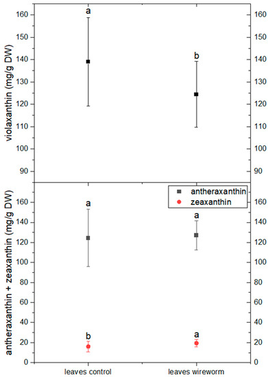 Concentrations of violaxanthin, antheraxanthin and zeaxanthin (mg/g DW) in the roots and leaves of non-attacked plants and plants which had been attacked by wireworms. Different letters (a, b) indicate statistical differences (p < 0.05) between control and attacked plants.