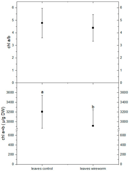Concentrations of chlorophyll a + b (µg/g DW) and the ratio of chlorophyll a/b in leaves of non-attacked plants and plants which had been attacked by wireworms. Different letters (a, b) indicate statistical differences (p < 0.05) between control and attacked plants.