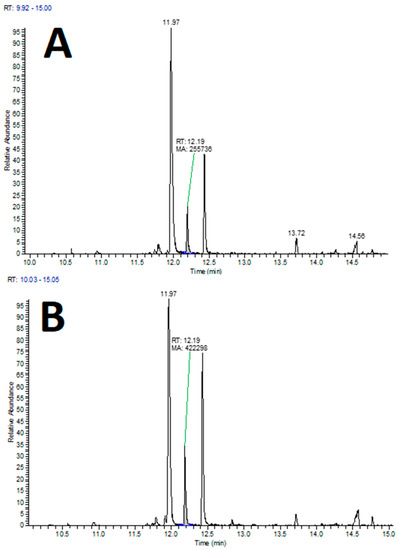 Examples of extracted ion chromatograms (XIC) from HS–SPME–GC-MS analysis of lettuce roots for the molecular mass of 2,4-nonadienal (m/z 138), with indicated peak of interest (at 12.19 min). (A) Lettuce roots control group; (B) lettuce roots infected with wireworms.