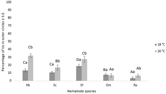 The chart displays the percentage of different nematode IJs in the outer circles after 24 h, depending on the temperature used in the experiment. The error bars correspond to the standard error. Capital letters denote statistically significant differences (p < 0.05) among the various nematode species at the same temperature, while small letters indicate statistically significant differences (p < 0.05) among the different temperatures within the same nematode species. The nematode species used in the experiment are as follows: Hb = H. bacteriophora; Sc = S. carpocapsae; Sf = S. feltiae, Om = O. myriophilus; Pp = P. papillosa.