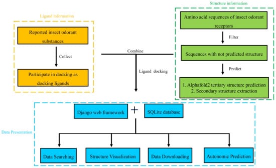 Here, we constructed a website capable of predicting the three-dimensional structure of insect ORs using Alphafold2, and used the predicted three-dimensional structure for molecular docking with common volatile odorants in plants. The website allows the query of sequences, secondary structure data, related references, three-dimensional structure, and docking information of insect ORs. The database collects the information of 4426 ORs of all insects currently available in the NCBI, 46 ligands and their information in PubChem, and 119,367 docking interactions between ORs and ligands. The users can browse, download, and access the information of insect ORs and the ligand data from the database. In addition, users can directly obtain the visualized secondary structure, three-dimensional structure, and docking posture of the ligands and ORs directly from the webpage, as well as perform a series of operations and labeling to record the screenshot of the structure of interest. The database also allows the users to browse structural data from an atomic perspective, such as atomic distance and bond angle, to gain a comprehensive understanding of the relevant information. More importantly, the database allows the users to submit their own sequences and use the database’s computing resources for the free prediction of three-dimensional protein structure and protein–ligand docking. The database can also widely receive sequence information related to insect ORs, providing a channel for users to add more OR sequences, and will be constantly expanded in the future.