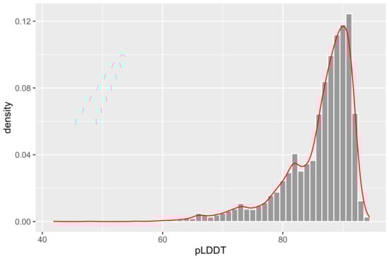 In total, 4426 protein three-dimensional structures were predicted by Alphafold2. The output results (Figure 2) showed that there were 1165 global pLDDT values above 90, 2665 global pLDDT values within 80–90, 478 global pLDDT values within 70–80, and 118 global pLDDT values below 70, which account for 26.32%, 60.21%, 10.80%, and 2.67% of the ORs, respectively. The pLDDT values of most predicted three-dimensional structures were above 80 and our predicted structures are also similar to many experimental resolved structures and predicted structures [17,53], which showed good confidence and could be used for further research (see Table S3 for details).