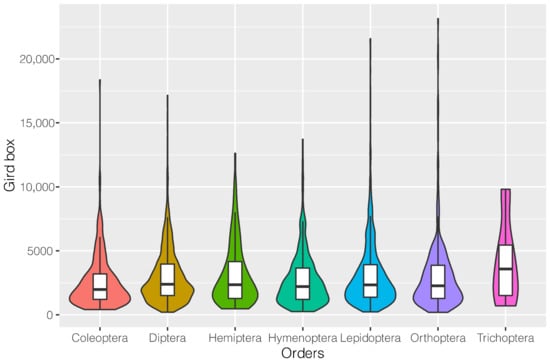 We then divided all the sequences into seven orders according to species, including Coleoptera, Diptera, Hemiptera, Hymenoptera, Lepidoptera, Orthoptera, and Trichoptera (Figure 3). Statistics was performed on the size of docking boxes whose sequences have been reported in the literature. The statistical results showed that the docking box of each order has a range of sizes, which are 414.27–6427.74 (mainly between 1227.73 and 3366.13 ) for Coleoptera, 200.88–7615.10 (mainly between 1502.20 and3950.45 ) for Diptera, 470.86–6831.30 (mainly between 1128.84 and 3737.00 ) for Hemiptera, 334.59–7723.05 (mainly between 1386.98 and 3924.36 ) for Lepidoptera, 189.11–7671.45 (mainly between 1270.55 and 3891.34 ) for Orthoptera, and 696.40–5825.97 (mainly between 1234.29 and 5825.97 ) for Trichoptera. In addition, although there were great variations in the size range of the binding cavity of a specific order, the binding cavity of most odorant-binding proteins did not differ significantly between different orders. Moreover, since each species has a certain olfactory preference, the outliers are likely the specific olfactory preference of some species.